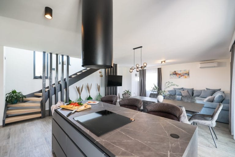 In the center of the house is an elegant open-space area that combines a fully equipped kitchen, living room and dining room, with direct access to a covered terrace - perfect for enjoying breakfast, a glass of wine or dinner with a view of nature.